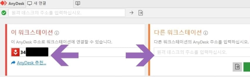 반대로 상대방이 고유번호를 여러분에게 알려줄 경우, 화면 우측의 '다른 워크스테이션' 주소란에 상대방의 고유번호를 입력하시면 됩니다. 그럼 여러분이 상대방의 PC를 원격 제어할 수 있게 됩니다.