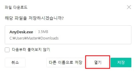 해당 파일을 저장하시겠습니까?라는 문구와 함께 anydesk.exe 파일 다운로드 창이 뜨게 되면 저장 버튼을 클릭하실 필요 없이 열기 버튼을 클릭해주셔도 됩니다.