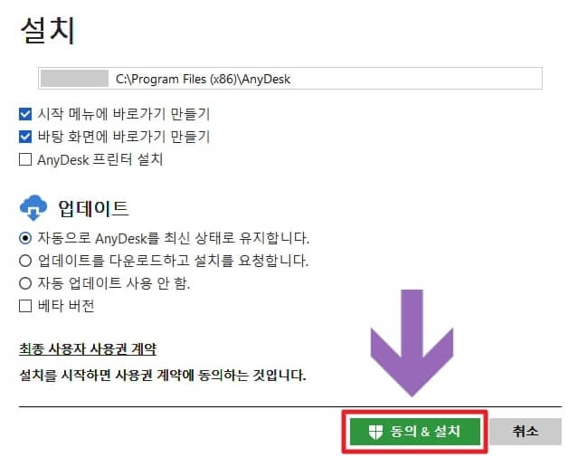 애니데스크 다운로드 창이 뜨게 되는데요. 애니데스크를 시작 메뉴 및 바탕화면에 바로가기 아이콘을 설치하고 싶다면 상단과 같이 체크를 해주신 뒤 하단의 초록색 '동의&설치' 버튼을 클릭해주시면 됩니다.